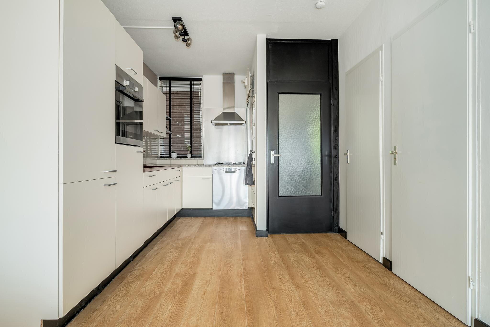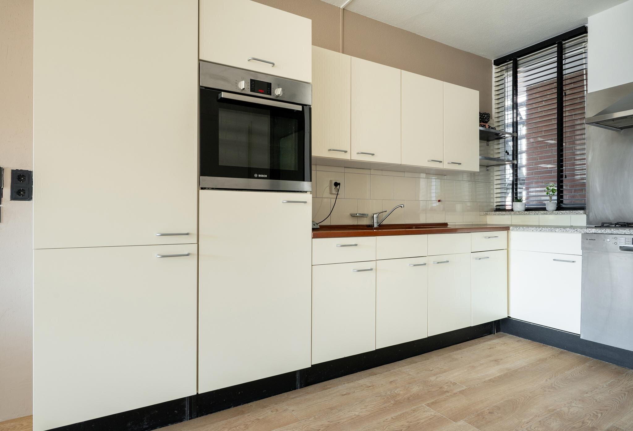 De open keuken beschikt over diverse boven- en onderkasten en is uitgerust met inbouwapparatuur, waaronder een combi-oven, afzuigkap, spoelbak, 4-pits gaskookplaat, vaatwasser en een koel-vriescombinatie.