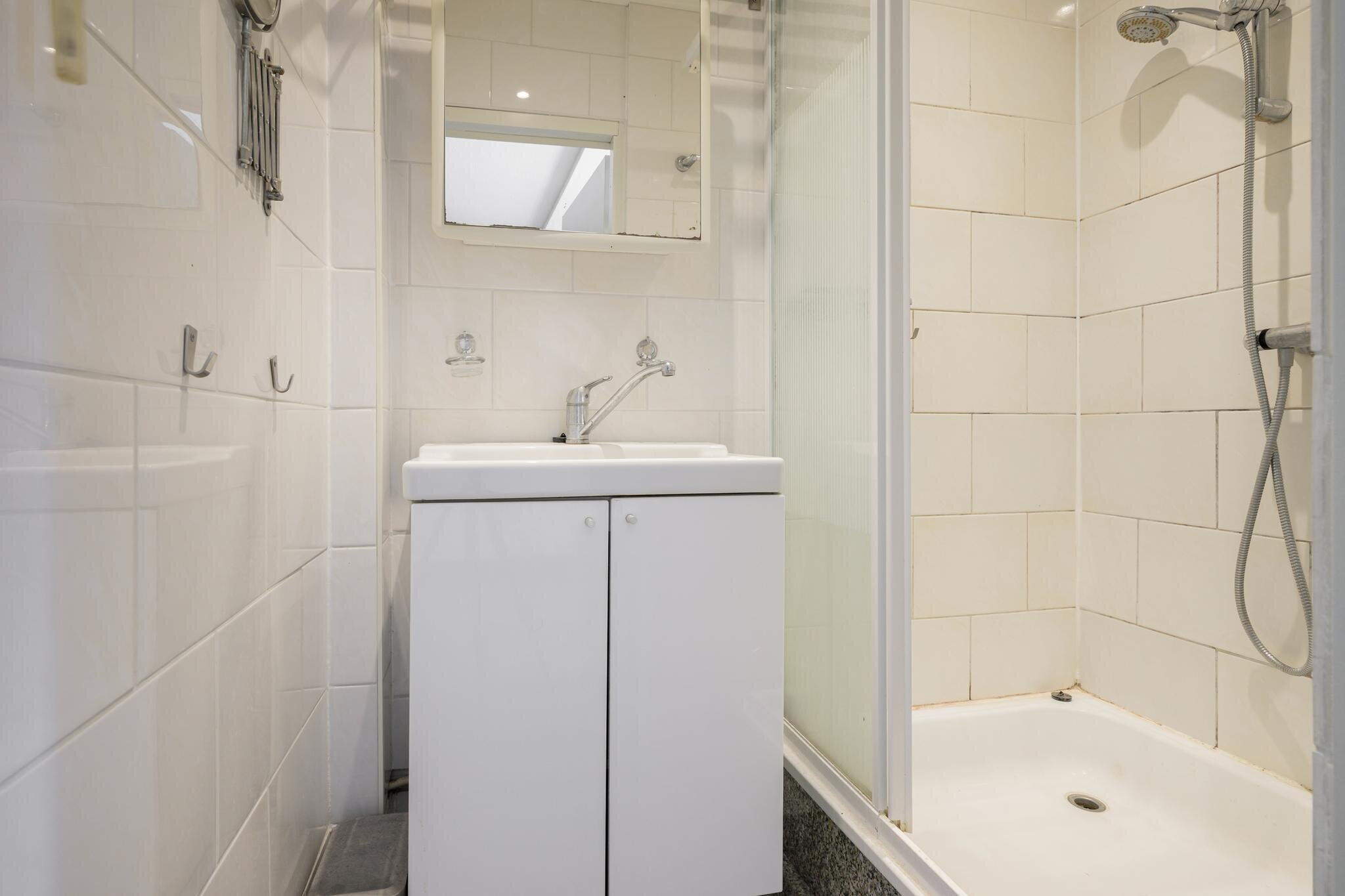 De badkamer (ca. 1.80 × 1.10 m) is uitgerust met een douche en een wastafelmeubel.