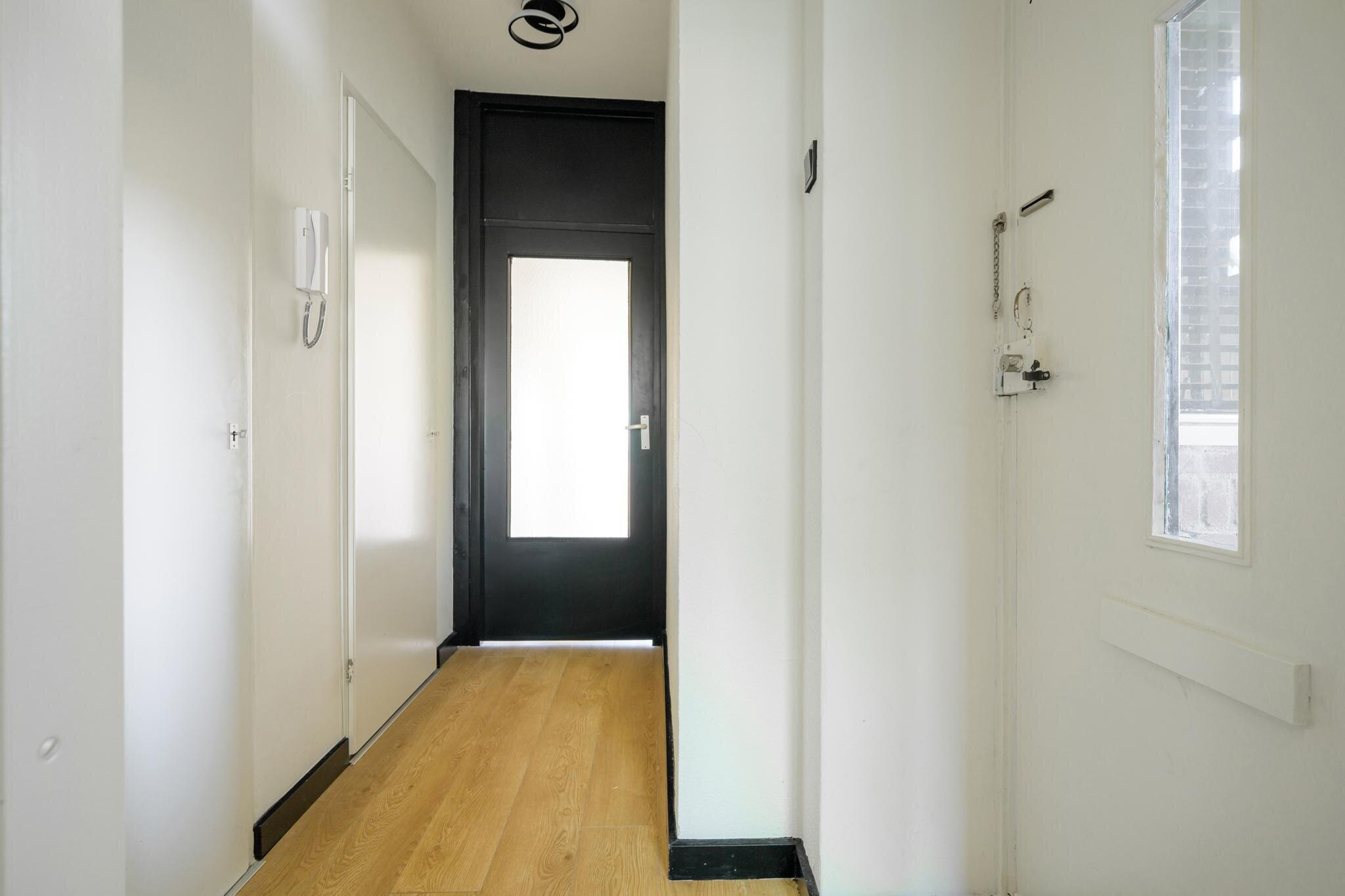 Via de entree/hal zijn de woonkamer, badkamer, slaapkamer en een ruime bergkast met wasmachineaansluiting bereikbaar.